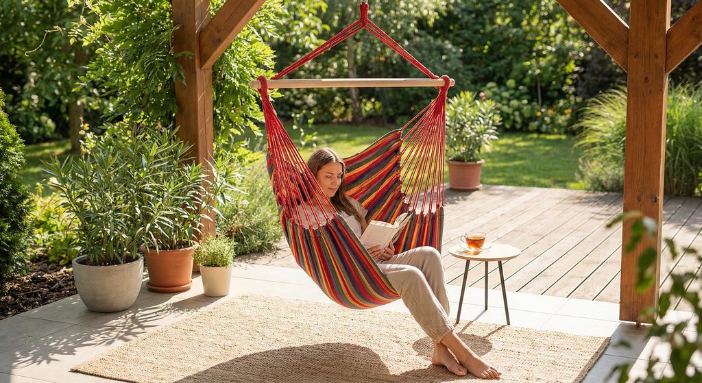 Tip: Kreslo by nemalo visieť moc nízko - pri dosadnutí sa látka natiahne, zároveň by však nemalo byť zavesené ani príliš vysoko - ideálna výška zavesenia je taká, kedy sa ľahko natiahnutými nohami dotknete zeme, teda aby spodná časť kresla bola 30-40 cm nad zemou.