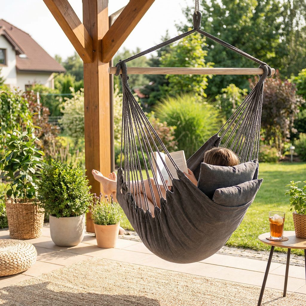 Tip: Kreslo by nemalo visieť príliš nízko - pri dosadnutí sa látka natiahne, zároveň by však nemalo byť zavesené ani príliš vysoko - ideálna výška zavesenia je taká, keď sa ľahko natiahnutými nohami dotknete zeme, teda aby spodná časť kresla bola 30-40 cm nad zemou.