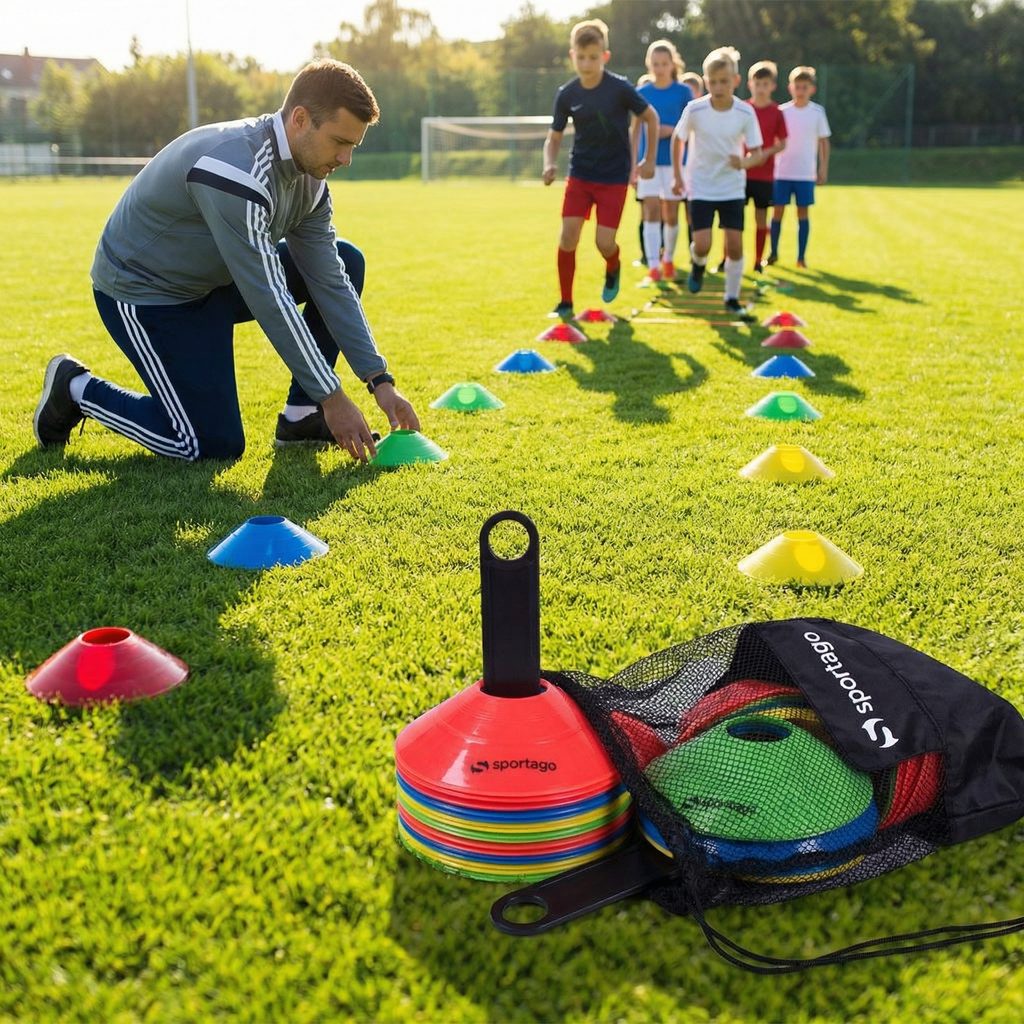 Zapojte sa do dynamických tréningov tímových športov s našou súpravou tréningových kužeľov Sportago ConeElite. Každá súprava obsahuje 20 kužeľov vo 4 farbách, ktoré prinášajú vizuálne rozlíšenie počas tréningu alebo pohybových hier. Červené, modré, zelené a žlté kužele umožňujú rôzne herné scenáre a stratégie.
